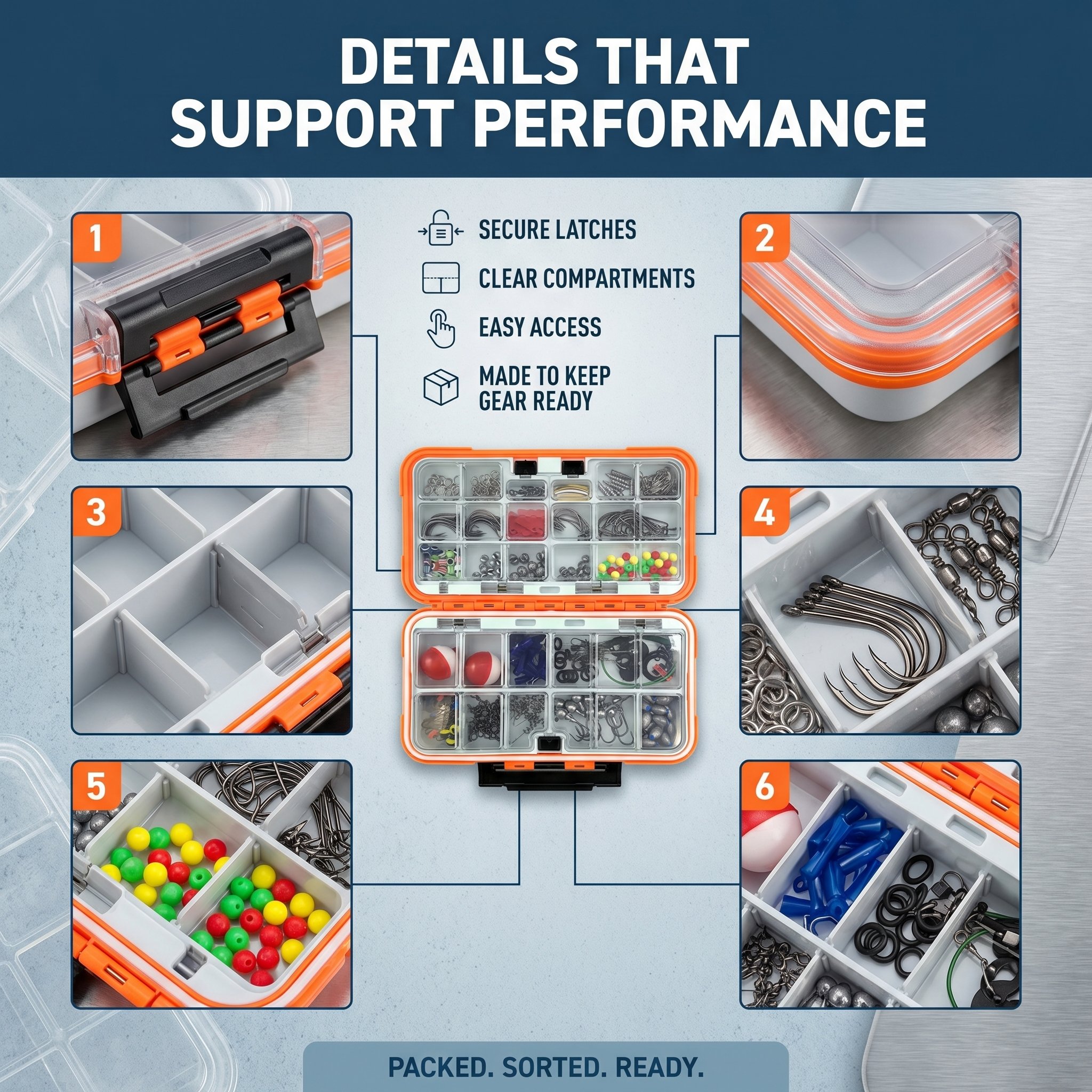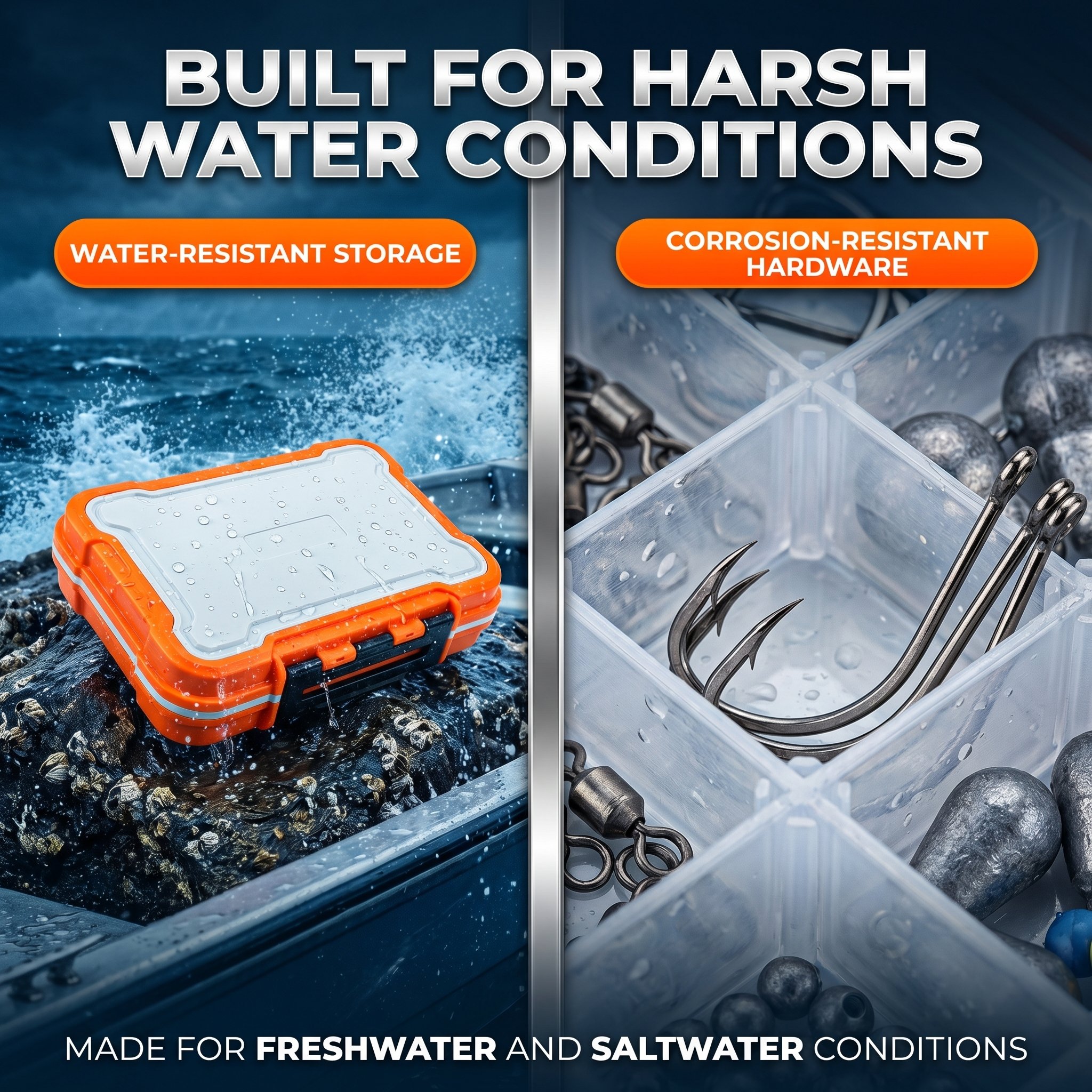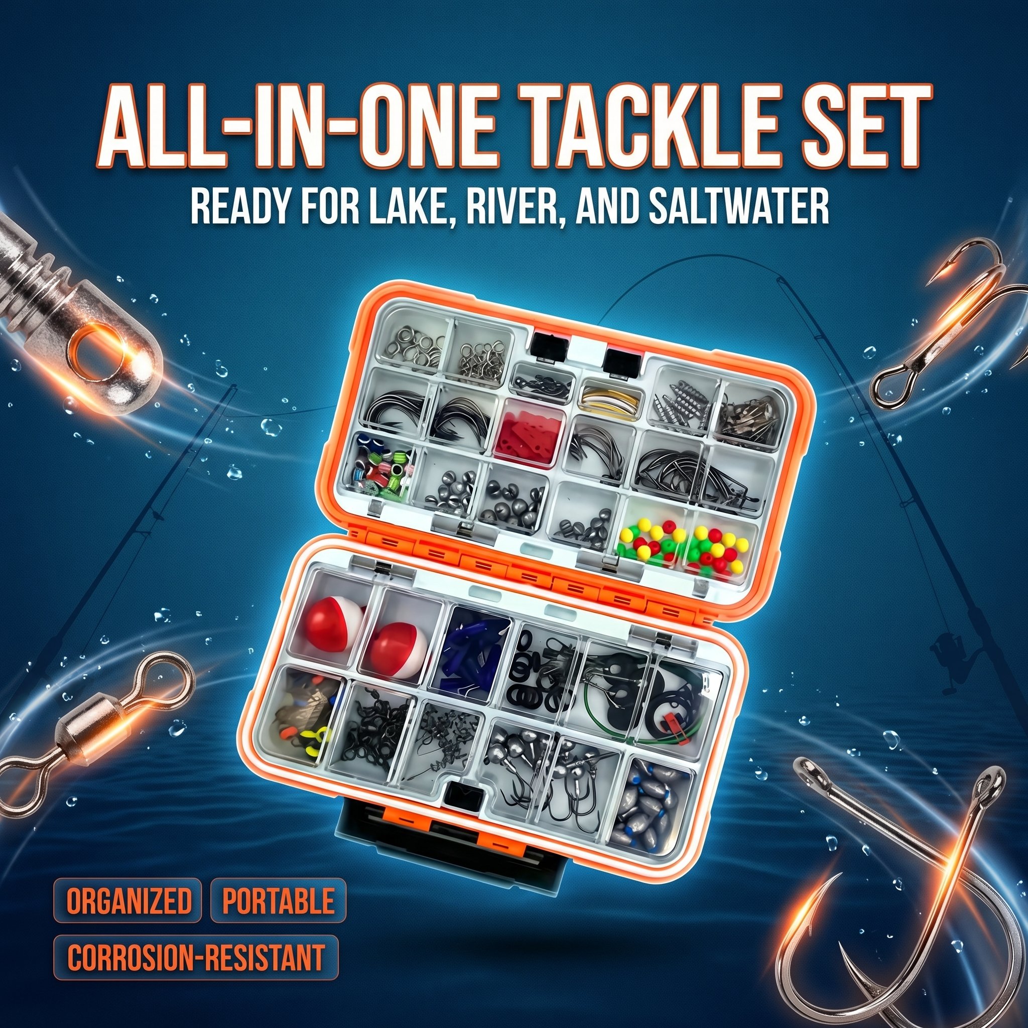 Each kit comes with a sturdy, waterproof tackle box with adjustable compartments to keep gear sorted, protected, and easy to access. Secure latches prevent accidental opening, while compact designs fit easily in backpacks, tackle bags, or boats.